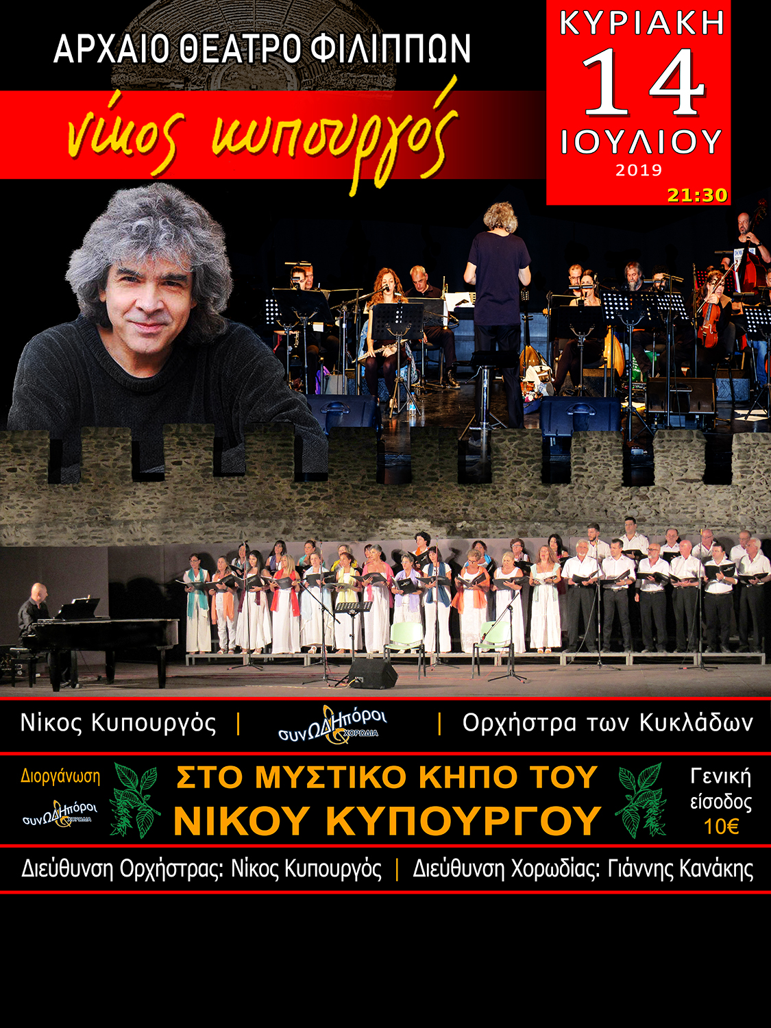 Λόγω των Εθνικών Εκλογών που ορίστηκαν για την Κυριακή 7 Ιουλίου 2019, η προγραμματισμένη συναυλία του Νίκου Κυπουργού, των ΣυνΩΔΗπόρων και της Ορχήστρας Κυκλάδων στο Αρχαίο Θέατρο των Φιλίππων, θα πραγματοποιηθεί ακριβώς μια εβδομάδα αργότερα, δηλαδή την Κυριακή 14 ΙΟΥΛΙΟΥ 2019.