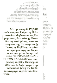 Μετά από τη σύσταση της χορωδίας σε Σωματείο τον Οκτώβριο του 2018, και σχετική αίτηση προς την Περιφερειακή Ενότητα Καβάλας, εγκρίθηκε η συμμετοχή του Σωματείου με διακριτικό τίτλο “Χορωδία ΣυνΩΔΗπόρων Καβάλας” στην επόμενη παρέλαση εθνικής επετείου της 28ης Οκτωβρίου 2019.