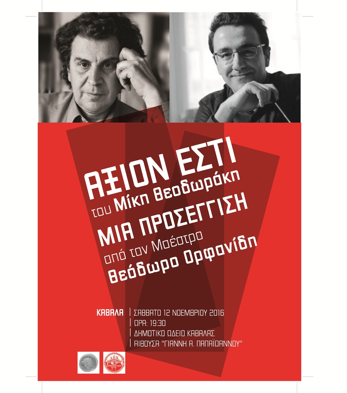 Το Δημοτικό Ωδείο Καβάλας διοργανώνει δύο πολύ ενδιαφέρουσες εκδηλώσεις στο τέλος της τρέχουσας εβδομάδας και στην αρχή της επόμενης. Συγκεκριμένα, το ΣΑΒΒΑΤΟ 12 Νοεμβρίου, ώρα 7:30 μμ στην αίθουσα «Παπαϊωάννου», θα παρακολουθήσουμε την διάλεξη-παρουσίαση του μαέστρου Θεόδωρου Ορφανίδη με τίτλο Άξιον Εστί του Μίκη Θεοδωράκη: μία προσέγγιση.