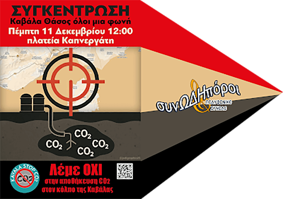 Το Πολυφωνικό Σύνολο Συνωδηπόροι Καβάλας εκφράζει την έντονη αντίθεσή του στην επιχειρούμενη αποθήκευση διοξειδίου του άνθρακα στον κόλπο της Καβάλας, ένα έργο που θεωρούμε πως συνιστά σοβαρή απειλή για το περιβάλλον, τη δημόσια υγεία και το μέλλον της Καβάλας, της Θάσου και των γύρω περιοχών.