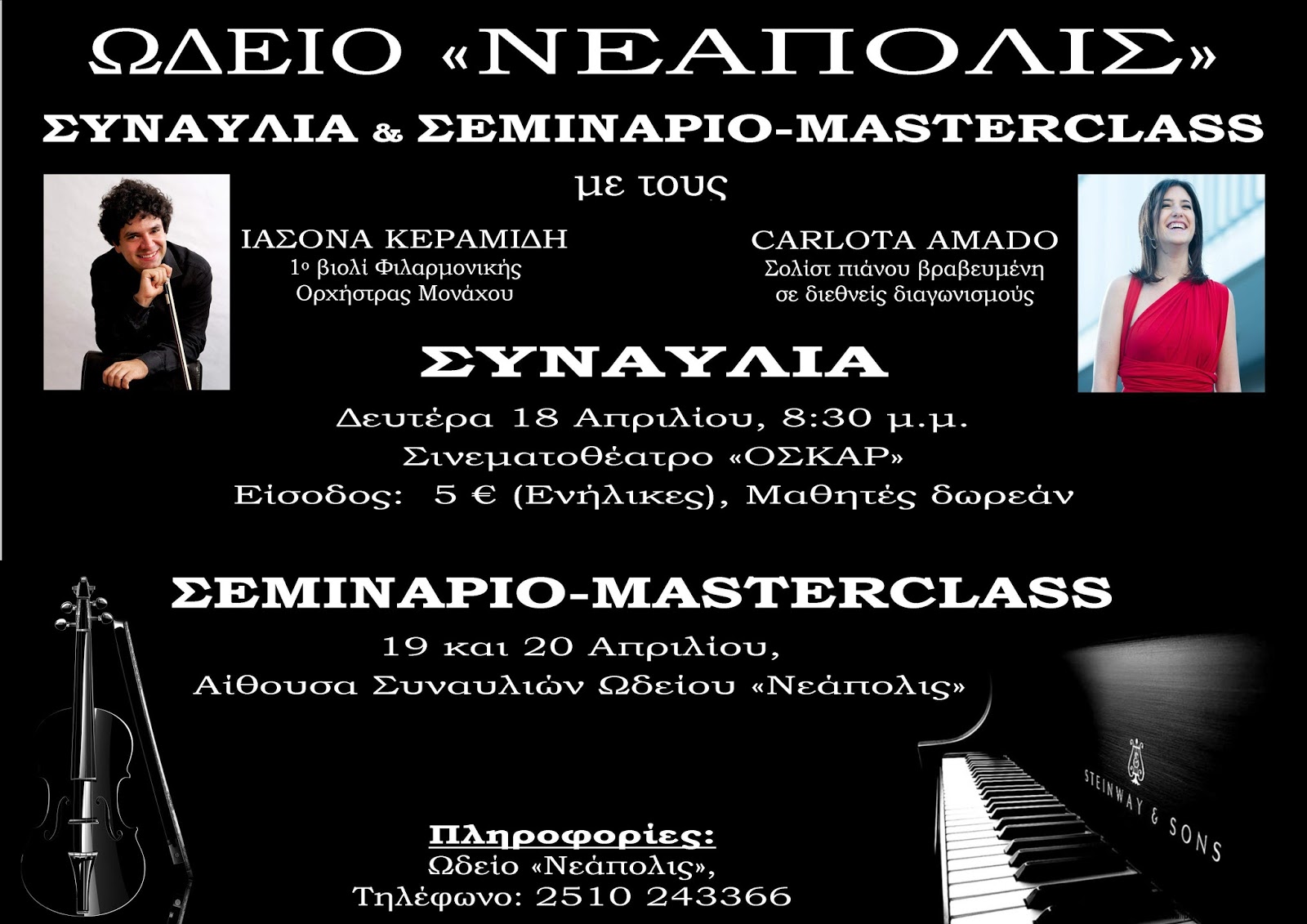 Επίσης, Σεμινάριο – Masterclass στις 19 και 20 Απριλίου στην Αίθουσα Συναυλιών του Ωδείου “Νεάπολις”.